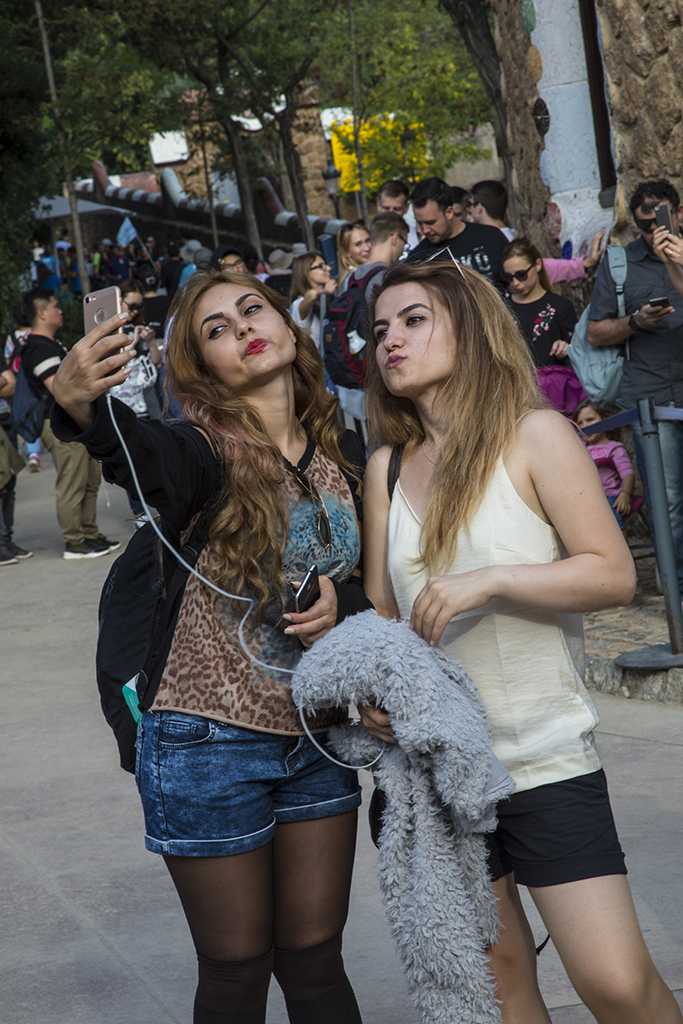 Previous Image Next Image Tourists, female, Barcelona, Spain, cell phone, selfie Two ladies mug for the camera in front of La Segrada Familia in Barcelona.