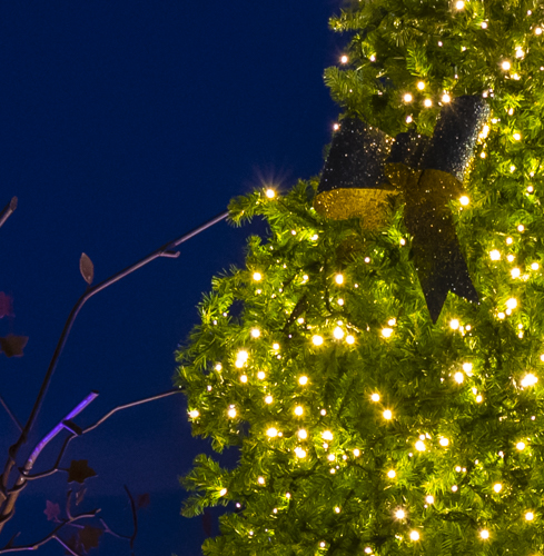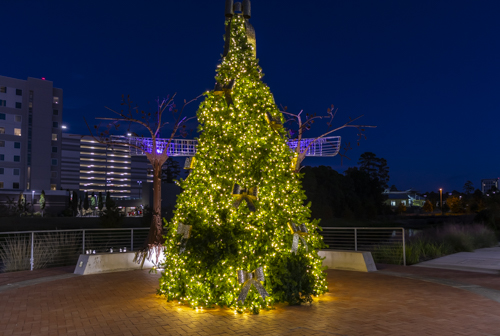 Previous Image Next Image Christmas tree, lights, twilight, The Woodlands, Texas, Hughes Landing. Christmas tree, lights, twilight, The Woodlands, Texas, Hughes Landing.