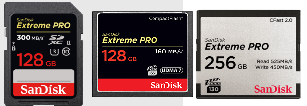 –CF Cards by Sandisk: 256 GB with 160 MB/s. 128 GB with 120 MB/s