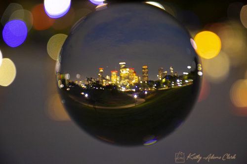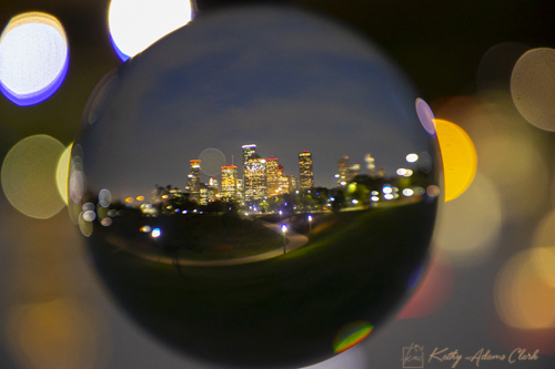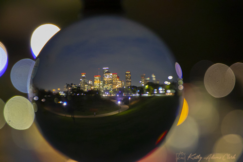 F/stop makes a difference in the photograph. Here’s the skyline of Houston photographed with f/5.6. Notice that the edges of the crystal ball are soft. Nice bokeh, though.