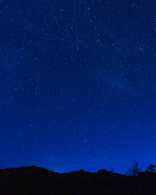 Nice, bright meteor overhead but the camera wasn’t focused. Jinxed!!Two meteors in the pre-dawn sky with the Milky Way.Nice pinpoint stars in the sky with a tiny meteor at upper center. Light from nearby towns on the horizon.Meteor from the Perseid shower in the pre-dawn sky. Notice that the stars toward the edge of the frame are nice and sharp.Comparison of two images. Left shows streaked stars toward the edge of the frame. Shutter speed was too slow. Right shows nice pinpoint stars along the edge of the frame. Shutter speed was right for the lens.