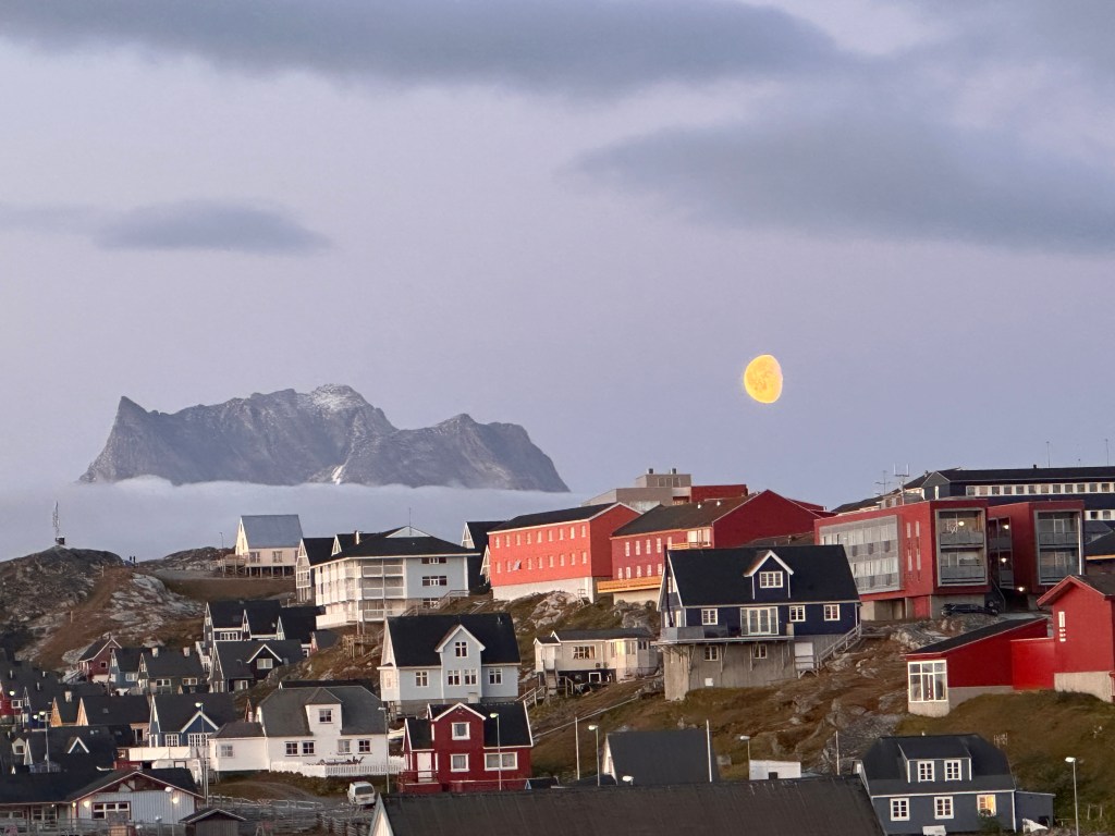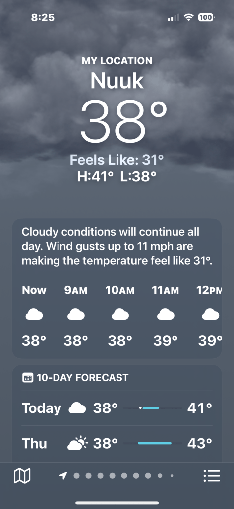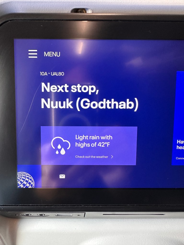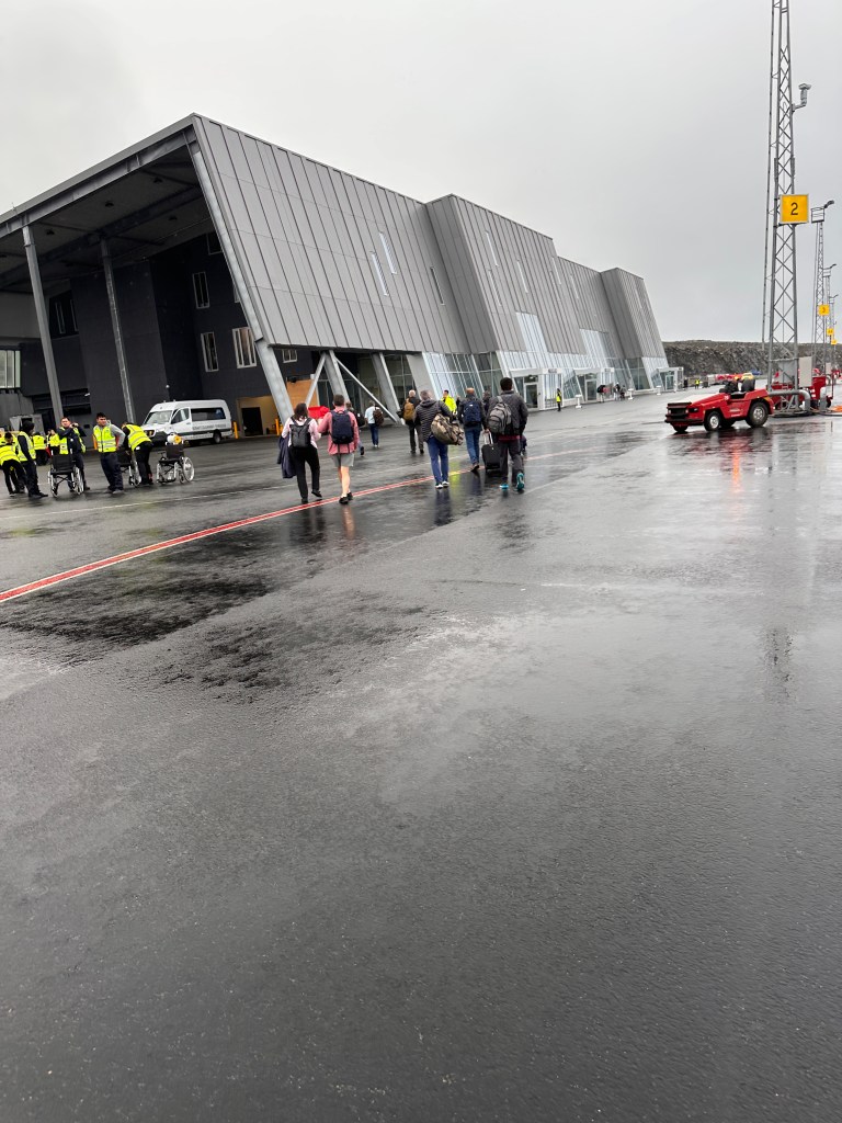 Arrival in Nuuk at 6:45pm. Travel time was 4 hours and 15 minutes. Meal on the plane but that was lunch. Pack your puffy jacket where you can get to it. There’s a walk across the tarmac and it is cold.