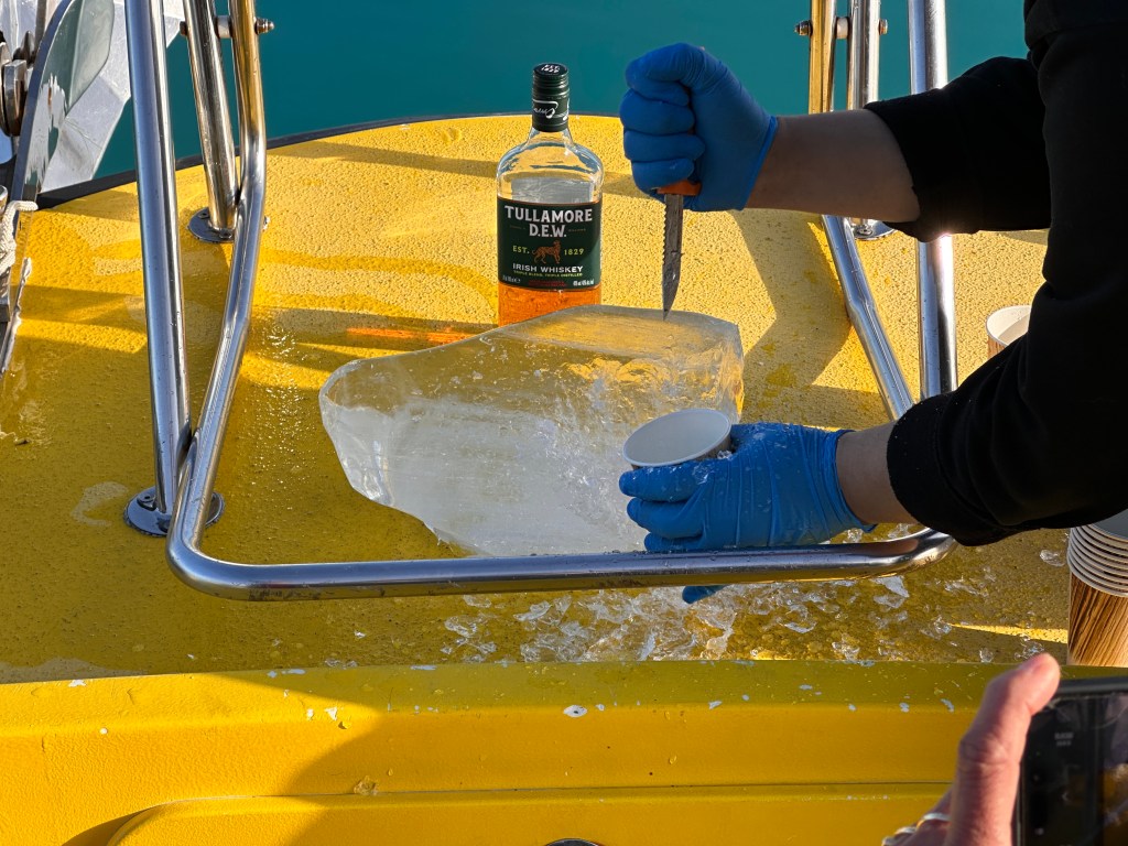 The sun came out when got to the base of the glacier, probably Ilulialik, and the captain killed the engine. That gave us a chance to enjoy the quiet and photograph the icebergs. The captain grabbed a piece of clear ice with his net, rinsed it off, and then let it dry in the sun. Then he chipped it into cups and poured a bit of whisky over the ice. We saluted, celebrated, took photos, and enjoyed the drink. I just ate the ice, which was very hard, since I’m not a fan of whisky.