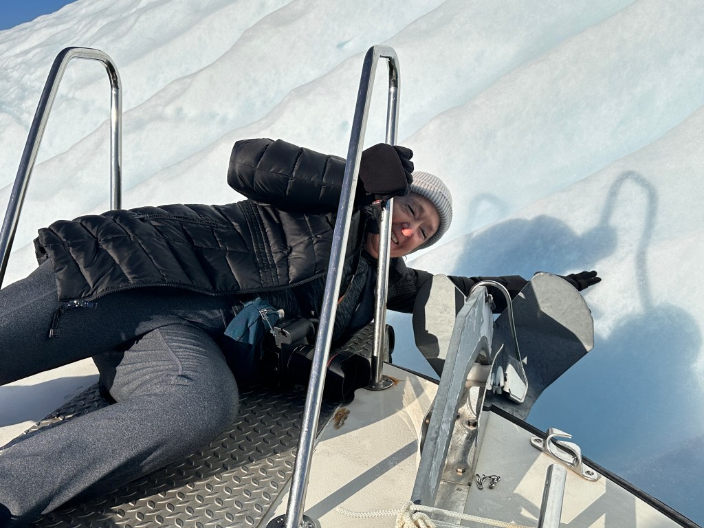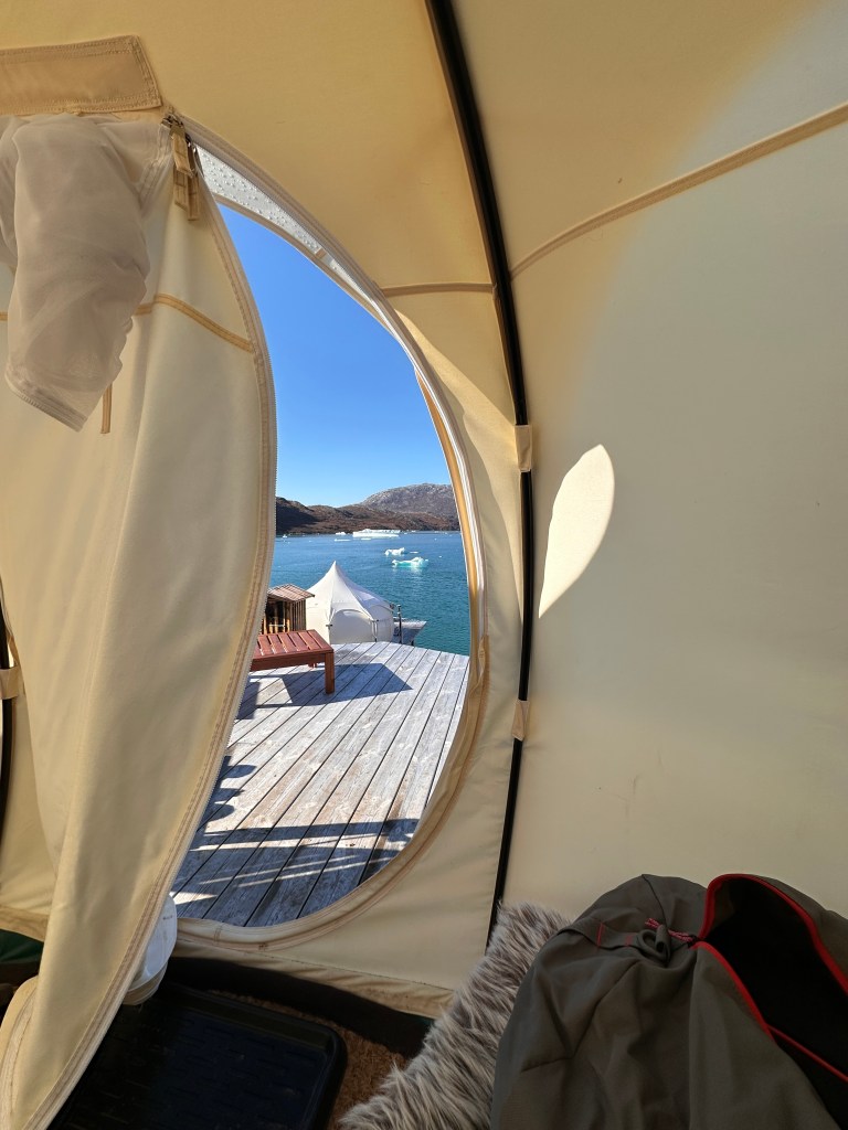 Arrived at the glamping site at 12pm. The boat captain circled an iceberg so we could all touch it. We took pictures of each other with our hand on the iceberg. ATV came down for luggage. Some hiked directly over the hills to the dining tent. It was steep. Others walked the road that the ATV used.
