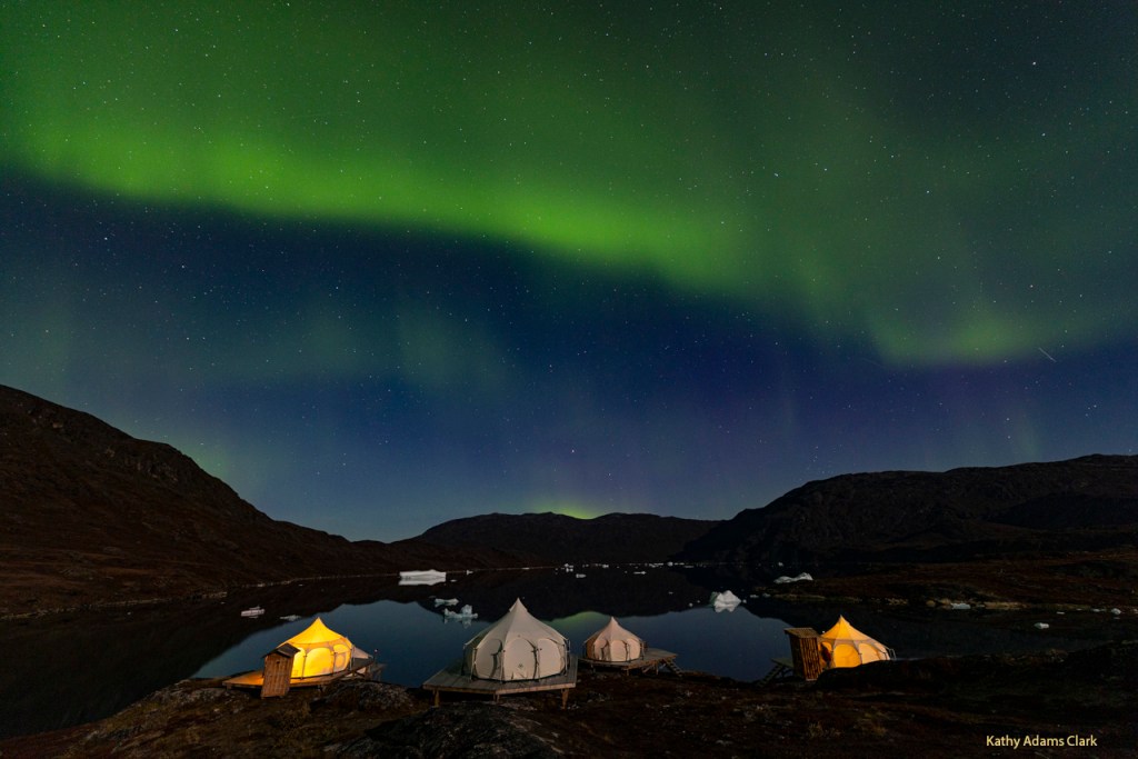 I got the 11:00pm time slot. The camp staff said the northern lights would be around 2am. When I looked out my tent at 11:00, there was a streak of light right across the sky. The white cloud effect and not the green light. I knew what it was so started hollering at the group. Everyone cooperated with an “I’m awake” so I knew we were all awake and ready to photograph.