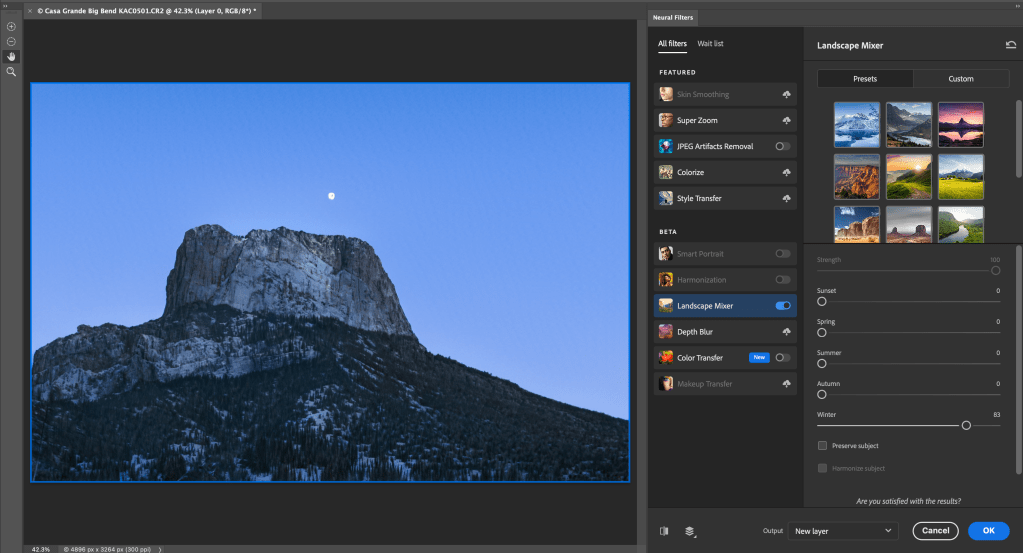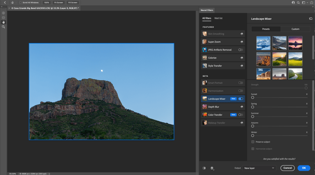 Open an image in Photoshop, click Filter>Neural Filters>Landscape Mixer to get this screen.