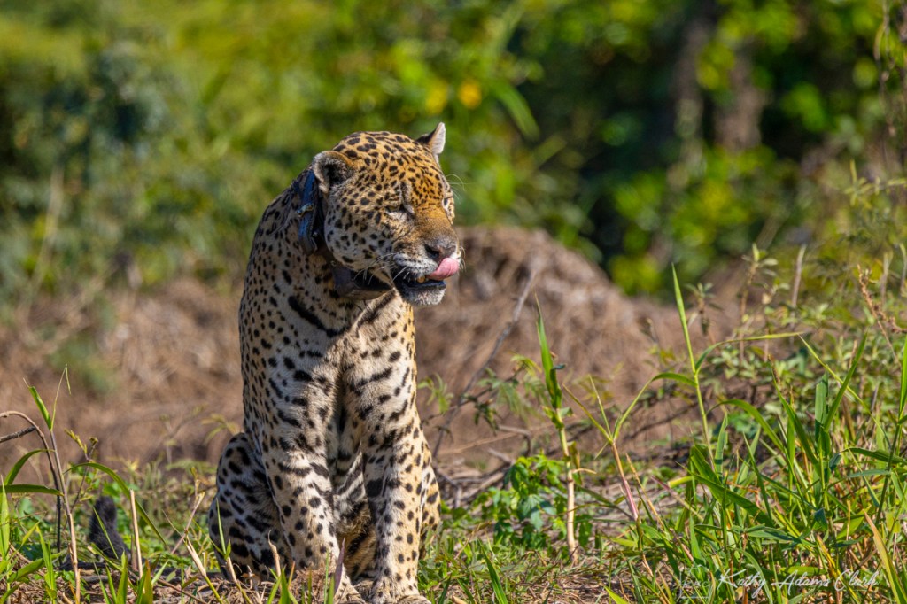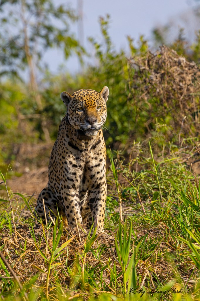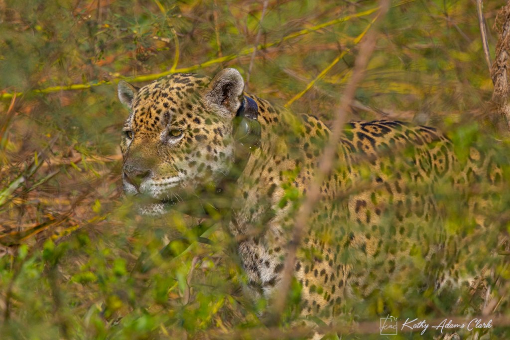 On our last day, we encountered a jaguar that locals had named Nels. He’s a handsome fellow with a huge collar. The collar is because he was rescued from wildfires in a previous year, rehabbed, and then released into the wild.