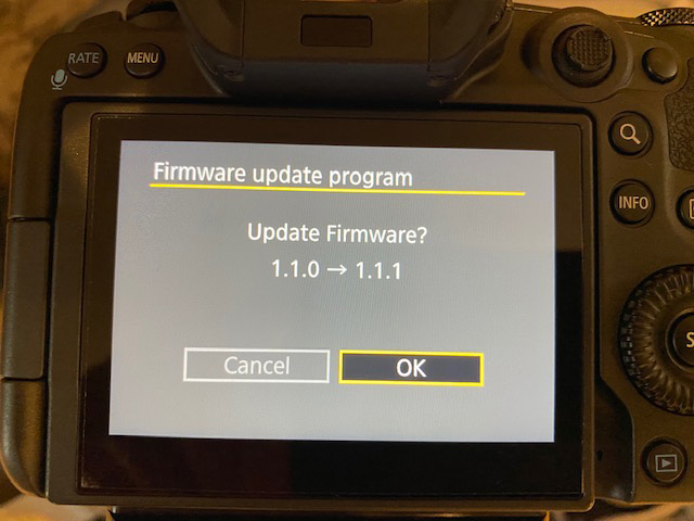 Put the SD card in the Canon R5. Turn the camera on and go to the wrench menu 5. Scroll down to Firmware Update. If you’ve done everything right, the camera will find the file and show the screen blow.