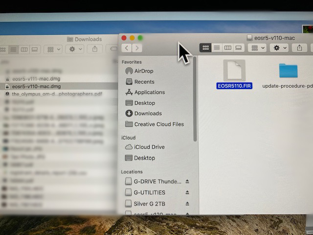 Copy or move the EOSR5110.FIR file to an SD card. (I do this with a card reader.) Plug the card reader into your computer. Open the card reader on your computer, open the firmware update in another window, then click and drag the xxxxxx.FIR file to the SD card.