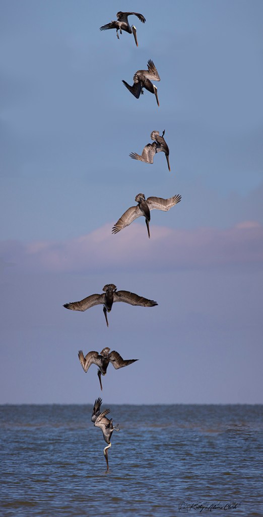 My first bird this morning was a ring-billed gull. It was just standing on the beach so not much of a challenge. Canon R6, 100-500mm lens with a 1.4x extender. Auto focus 1, Servo, one focus point.Sanderling running on the beach. Same setting as above but using wide area auto focus. The camera stayed in focus. My job was to keep the camera on the bird.Sanderling with the same settings as above. Remember, these birds seem to never stand still.Royal tern in flight. Wide area auto focus. There were 10 or 12 shots in this series as the bird flew by. All were in focus. Brown pelican going into a plunge dive. With the R6 on rapid release, I captured 10 or more shots as the pelicans did their dive. Each was in focus..