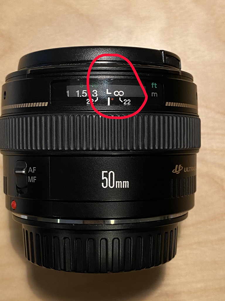 Canon traditional lens with focus set to infinity by aligning the white lines. (Nikon and other lenses align the line with the infinity symbol.)
