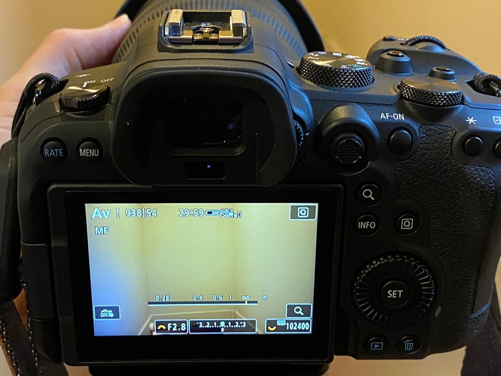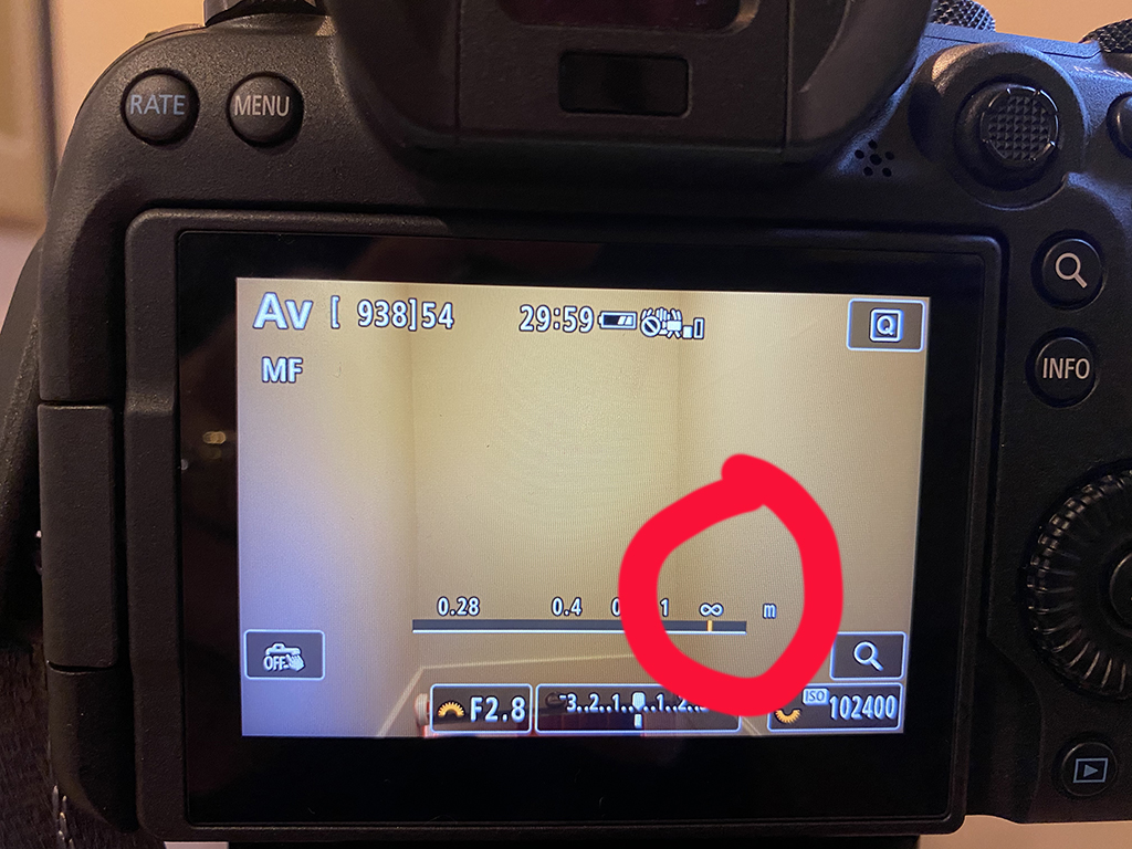 To set the focus to infinity on a R5 or R6 mirrorless camera, go to live view. Flip the switch on the lens to MF. Turn the focus ring to align the focus with the infinity symbol. NOTE: Sony mirrorless users rotate the focusing ring until the infinity symbol appears. Stop when the symbol appears! You’ll go out of focus if you continue to rotate the focus ring.