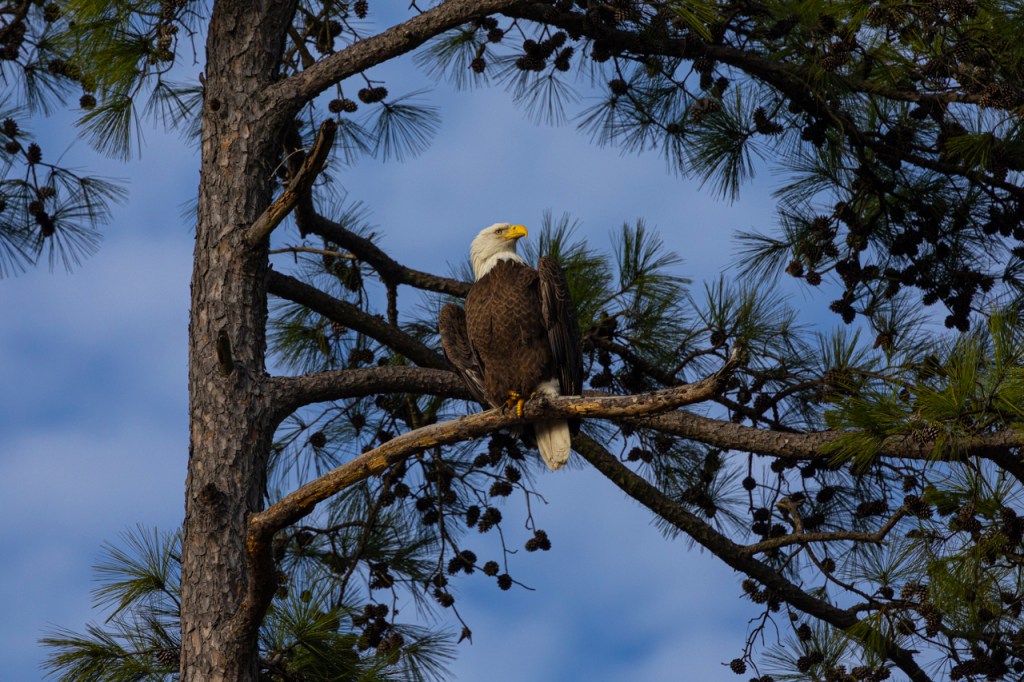 Bald eagle is a nest shooting through trees in the foreground. Handheld Canon 100-500mm lens with a 1.4x extender. One point focusing on the eagle.100% enlargement showing the Canon R3 focused through all the mess on the eagle’s head and produced a sharp photos.I walked closer to the eagle’s nest. R3 focus does not get distracted by the brush.100% crop.Animal eye focus continues to stay with the eagle as it moves around the tree.100% of that image.Viewfinder Simulation allows me to under exposure to maintain the white feathers.100% enlargementThere’s a northern mockingbird in this bush. The Canon R3 locked onto the eye and held focus despite all the tangle of brush in front of the bird. No coaxing on my part. The camera did all the work.Ruby-crowned kinglet is a hyper-active little bird that never sits still. The Canon R3 found the eye and stayed with the bird as long as I could keep the bird in the frame.Uncropped image of a white-throated sparrow in the brush. The Canon R3 found the eye and stayed with the bird. This is an easy one because the sparrow wasn’t very active. The Canon R3 didn’t get distracted by any of the round leaves nearby as we’ve seen with the R5 or R6.There weren’t a lot of flying birds during my test run. The wind was blowing hard and erratic. A few black vultures flew across, though. I raised the Canon R3 and the camera immediately found the bird. No hunting or hesitation. The Canon R3 stayed with the bird as long as I could keep it in the frame.
