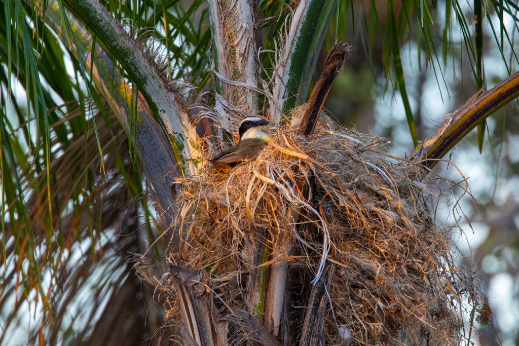 During our recent photo tour to Costa Rica, the group noticed a nesting pair of s great kiskadees in the parking area. The birds built their nest in a palm tree right in the main parking area of the lodge. We walked below the nest to meals and returning from meals.