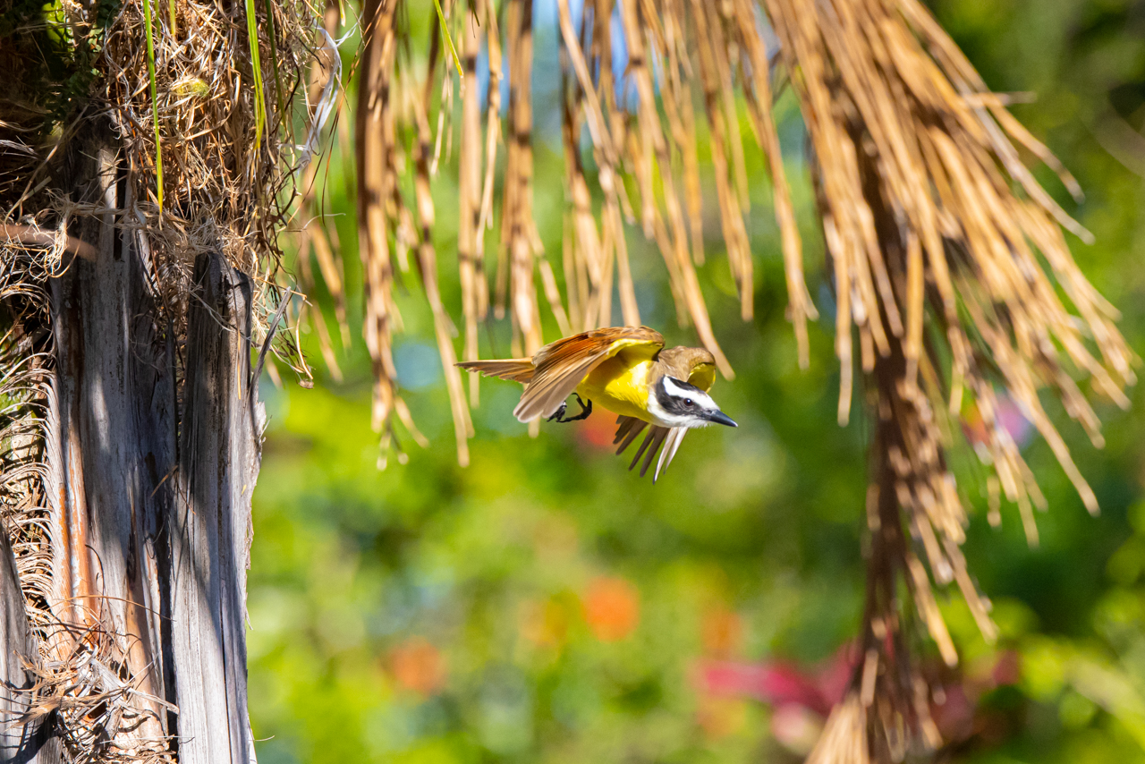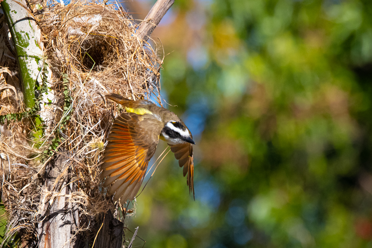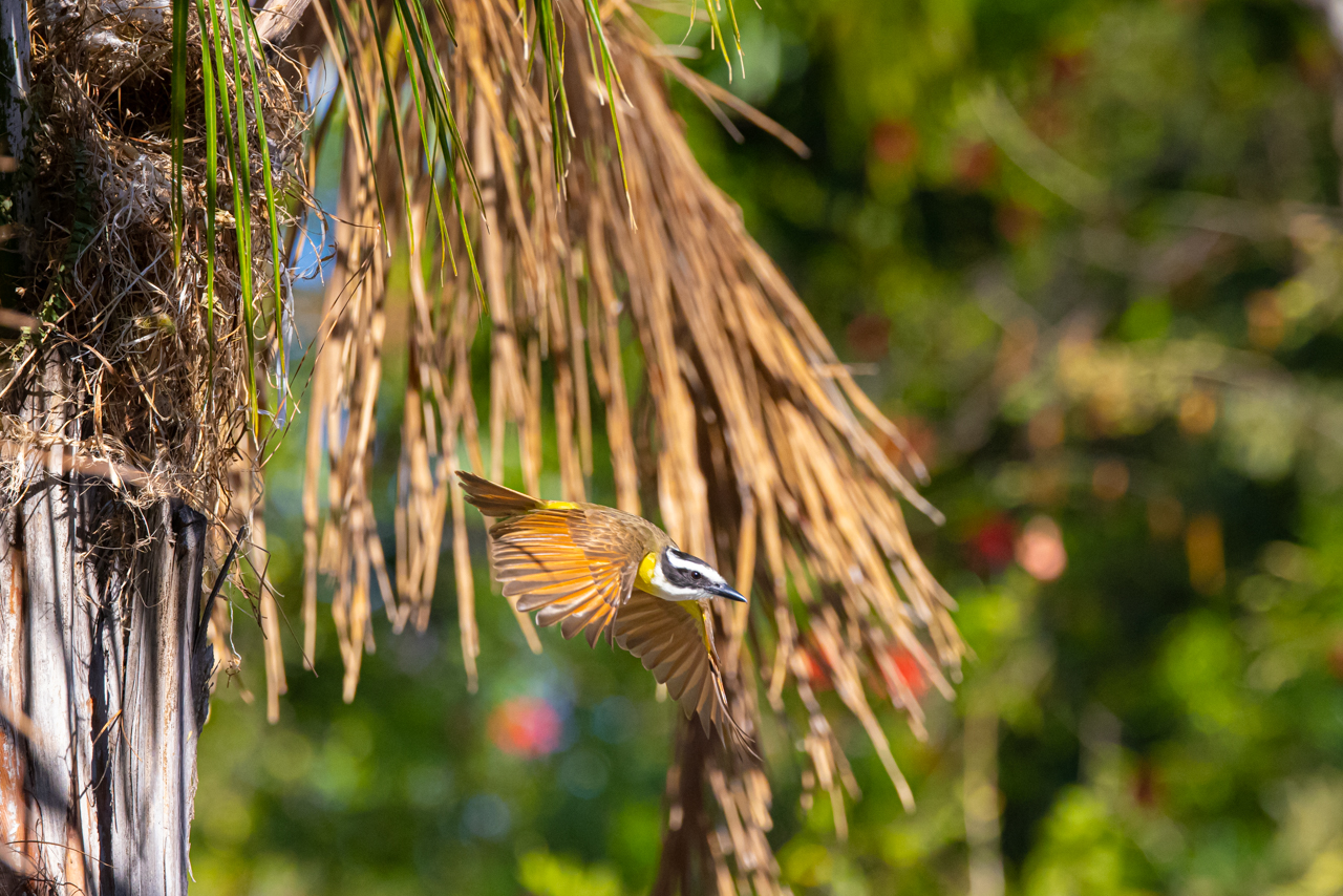 Great kiskadee nesting in a palm tree near the Rincón de la Vieja Volcano in northern Costa Rica.