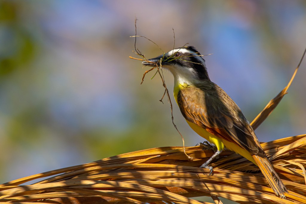 Great kiskadee with a beak-full of nesting material.
